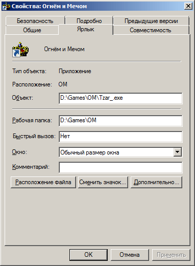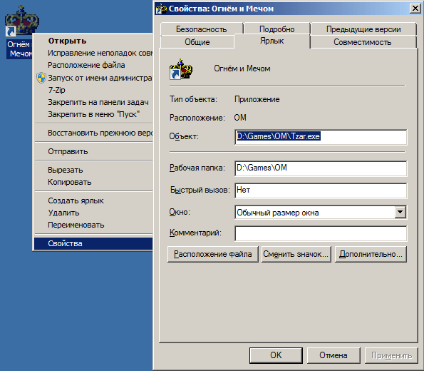 7) Правим свойства ярлыка игры "Огнём и мечом"